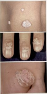 手のひらや足の裏、指などによく見られ、ザラザラとした盛り上がりが特徴です。