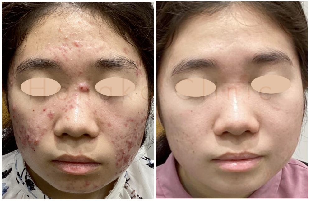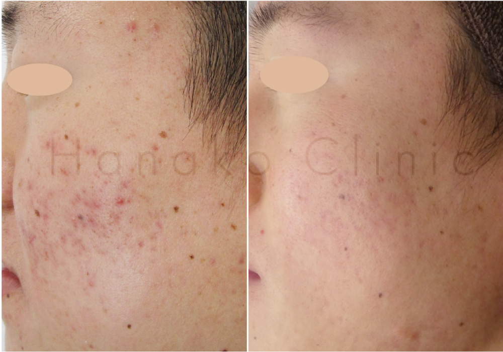 こちらはイソトレチノイン内服4ヶ月とサリチル酸ピーリング4回、CO2フラクショナルレーザー3回を行った患者様の症例です。