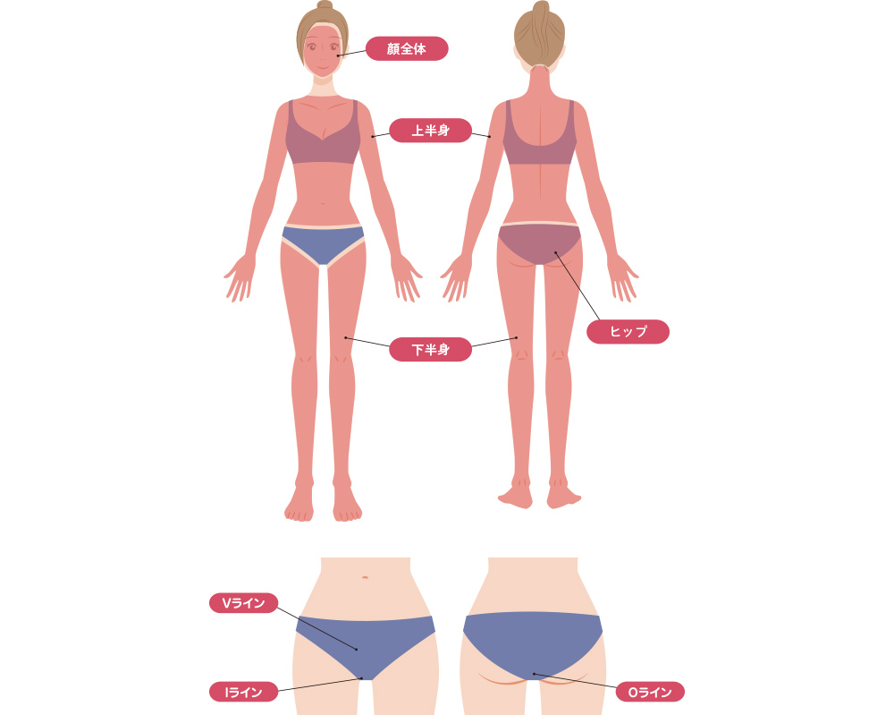 (胸、お腹、背中、肩、脚、膝裏などの産毛も忘れずにご剃毛ください。)