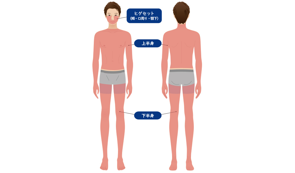 額から頬、口周り、顎下までの顔全体を脱毛します。肌がトーンアップして清潔感が増し、ひげ剃りが不要になるためカミソリ負けに悩むこともなくなります。